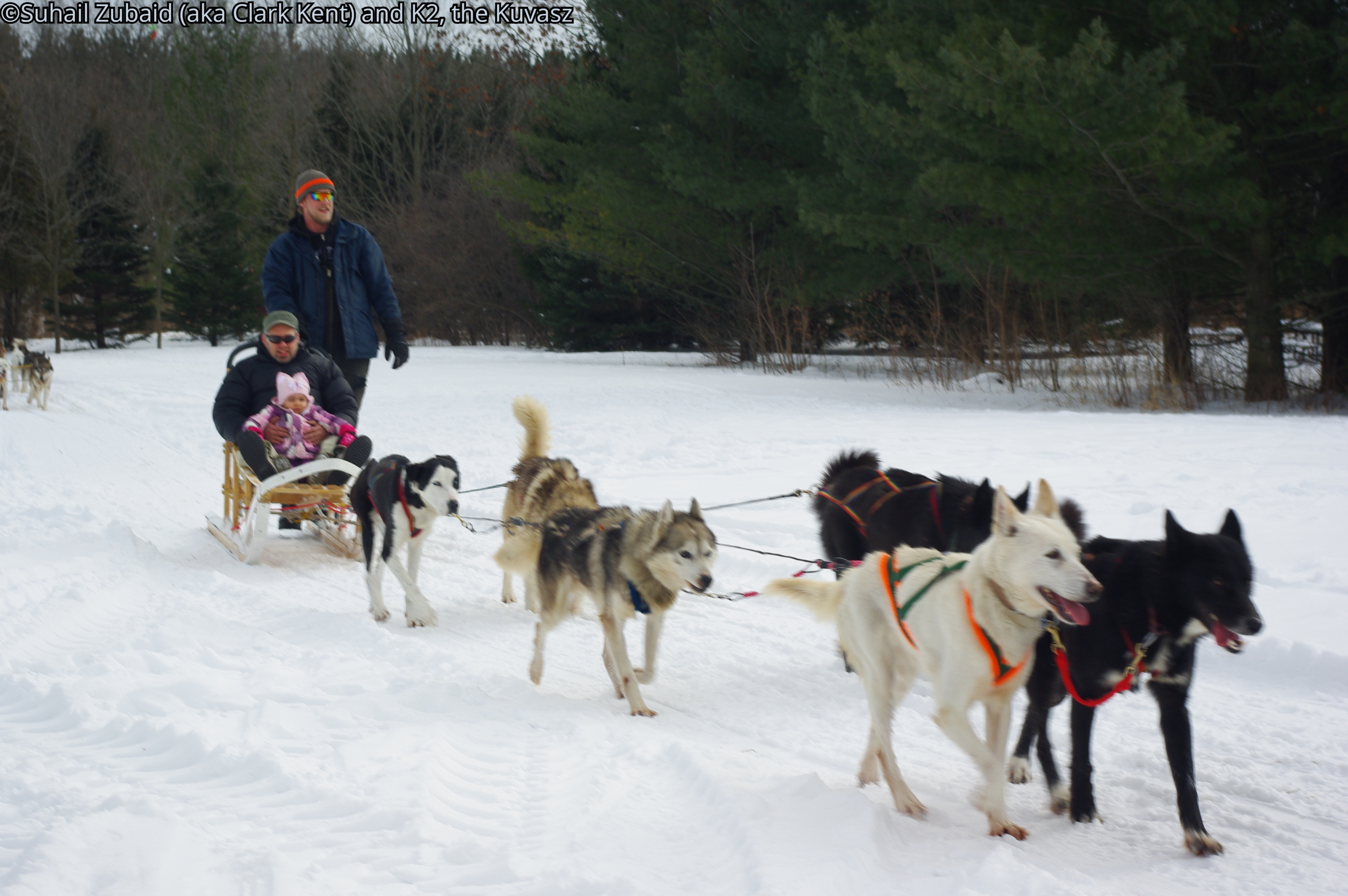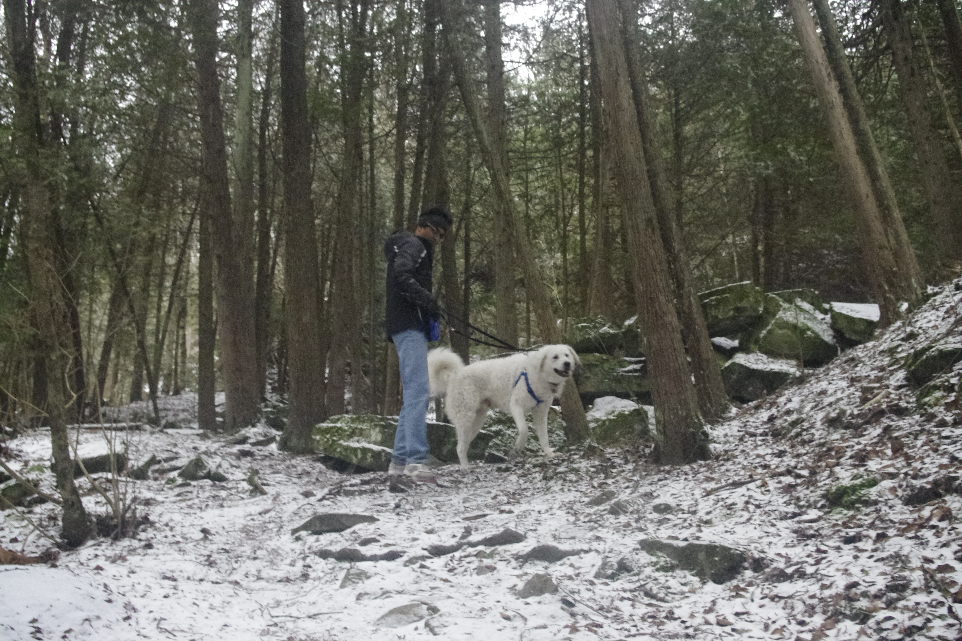 What if it is snowing and it is windy? When that happened once to me on Bruce Trail in Caledon Hills, it felt like my face was constantly being barraged by bee stings. Sometimes, I had to walk backwards with K2 leading the way. How does he fare in a situation like this? Not very differently! He has a same characteristic Kuvasz posture all the time – tail in a low curve and head stooping low as if sniffing the snow for a hidden edible treasure.