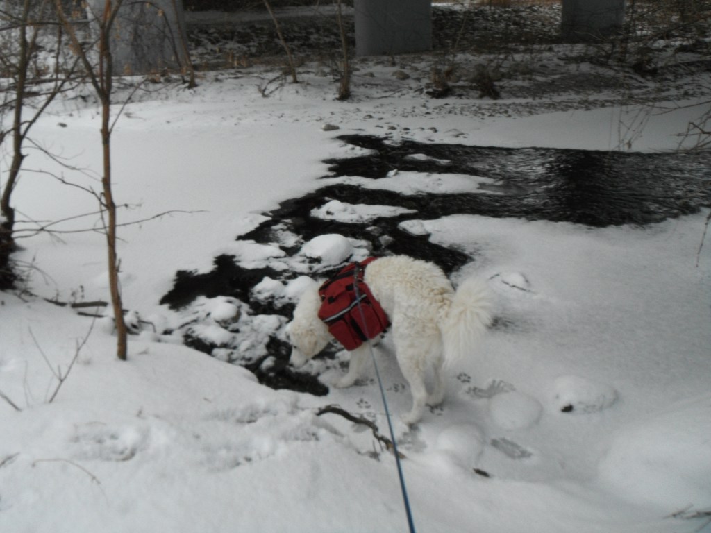 Once I felt better, I looked at K2, my, then, 12 months old Kuvasz boy and affectionately known in the neighbourhood as the Polar Bear, trying to determine how he was faring. And there he was, totally unimpressed by the freezing temperatures, about to descend down the bank slope on to the frozen part of the creek. Whenever he is about to do this, I am very careful. I let him go to frozen water surfaces slowly holding and releasing leash like a mountaineer belays his partner.