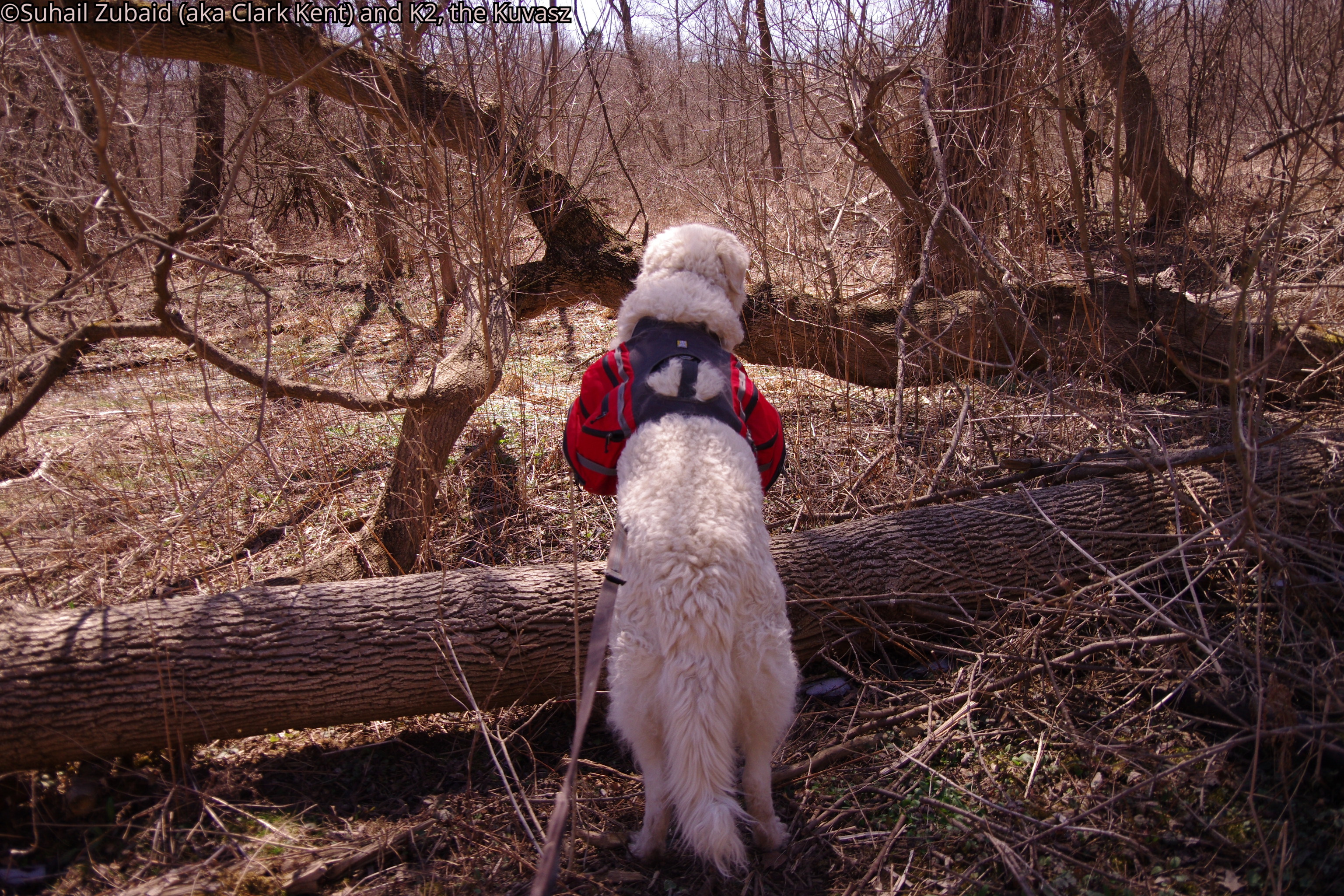 K2, the Great white Kuvasz and a livestock guardian dog (LGD) breed originating from Hungary, was hiking about 3 meters (3.28 yards) ahead of me. It was a typical late spring/early summer hike on the side trail leading to Halfway Log Dump of the main Bruce Trail of the Bruce Peninsula National Park.