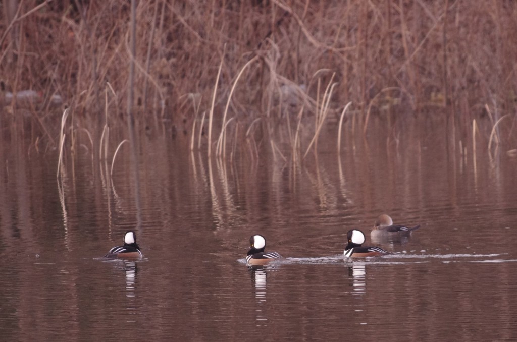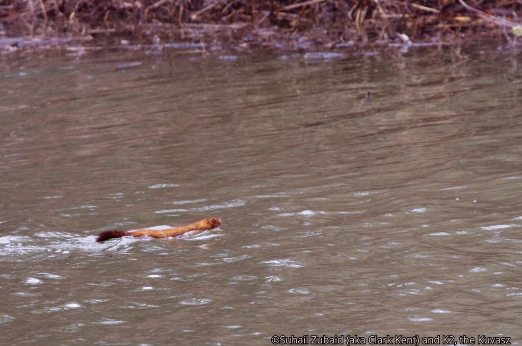 I walked past the flood control pond. There was a raft of four mallards foraging. I stopped to observe how they were diving to get to the vegetation. All of a sudden, I saw a brown, furry animal swimming through the raft. All the 4 mallards converged to see what was swimming through them. I took out my camera, but it was close to dusk. I could not get a shot. But I trained my eyes on the movement of the animal. It came out of water on the other side.