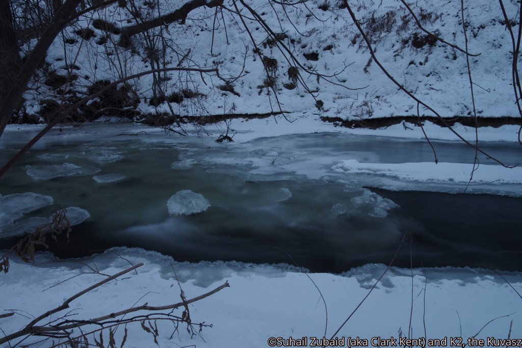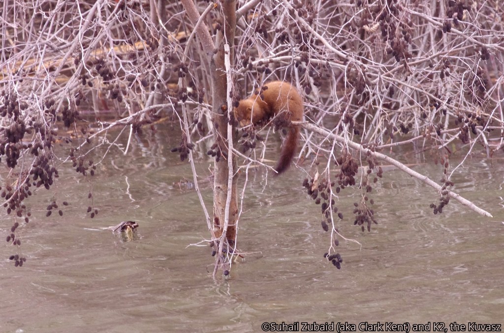 It was a cloudy day with temperatures hovering around -10 C. K2 and I were hiking without a trace of another human on a trail that meandered its way along a creek that was partially frozen. The trail itself had turned icy on several stretches. I was expecting to find deer at the most, perhaps house finches, and a few other birds that normally liked to spend winters there. I was a bit surprised to catch a glimpse of what I initially thought were two squirrels scampering under the fallen trees along the creek under those circumstances.