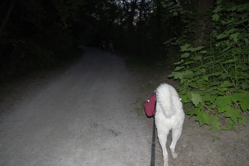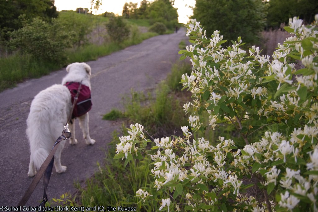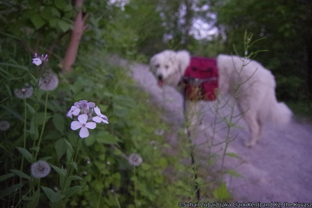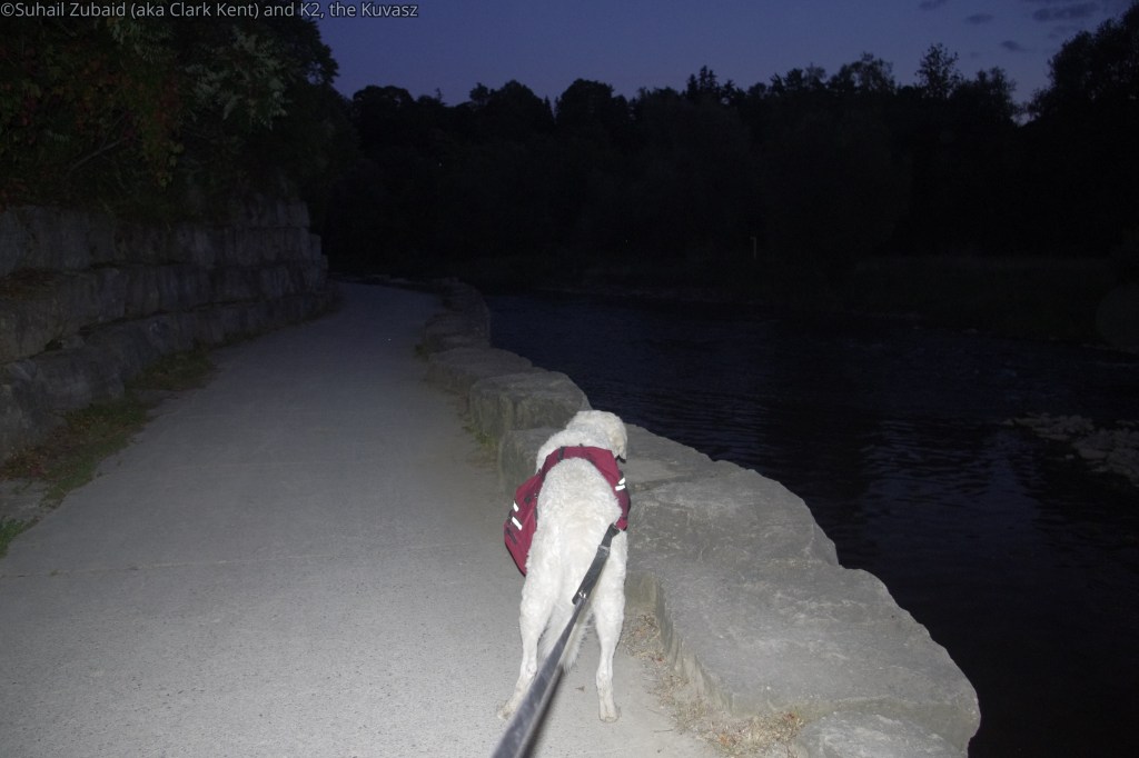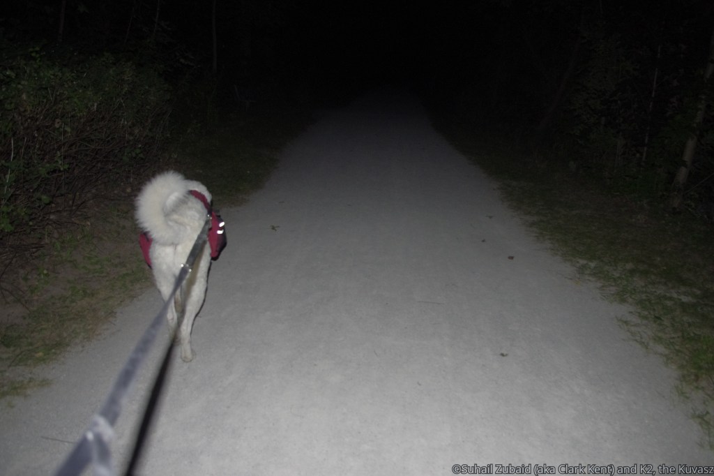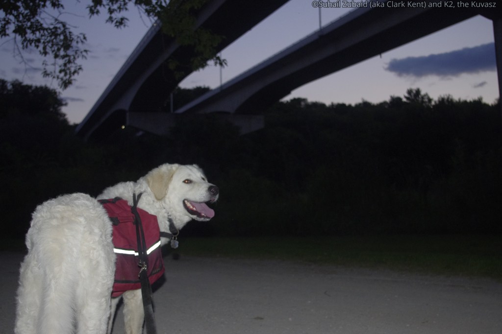 When my my wife reached our rendezvous at Erindale Park on a surprisingly chilly night of August 14, 2015 at 9 pm, she saw me with K2, our Hungarian Kuvasz, and later described the scene to our children as, “Because of the cold, he was wearing K2 like a quilt”.