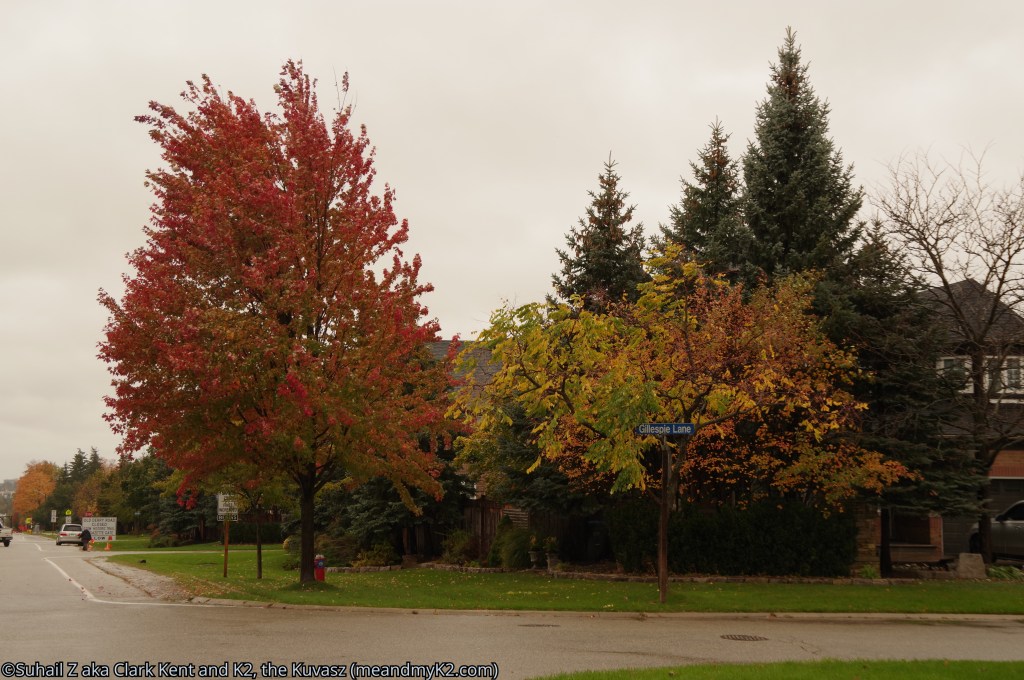My home itself has a Norway Maple (first shot in the foreground) planted by the Municipality, which is the worst maple to have. Norway Maples don’t turn red, but just reddish dark brown in the fall season; are not used by local birds for nesting; and kill local species of plants. The only reason why they are popular with the Municipalities across Ontario is that they can tolerate high level of heat from concrete and pavements.