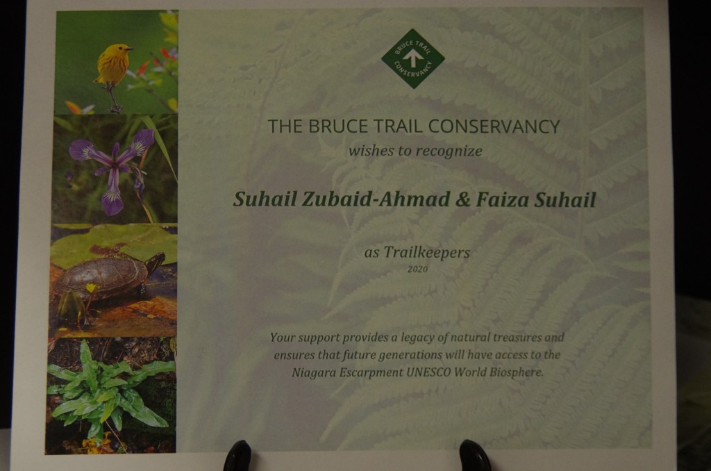 I am also a member of Bruce Trail Conservancy and my contributions have been acknowledged from time to time. Please see the pictures below. These shots are from my office room. Needless to mention, I am known as a hiker and a dog and a wildlife lover in my office.