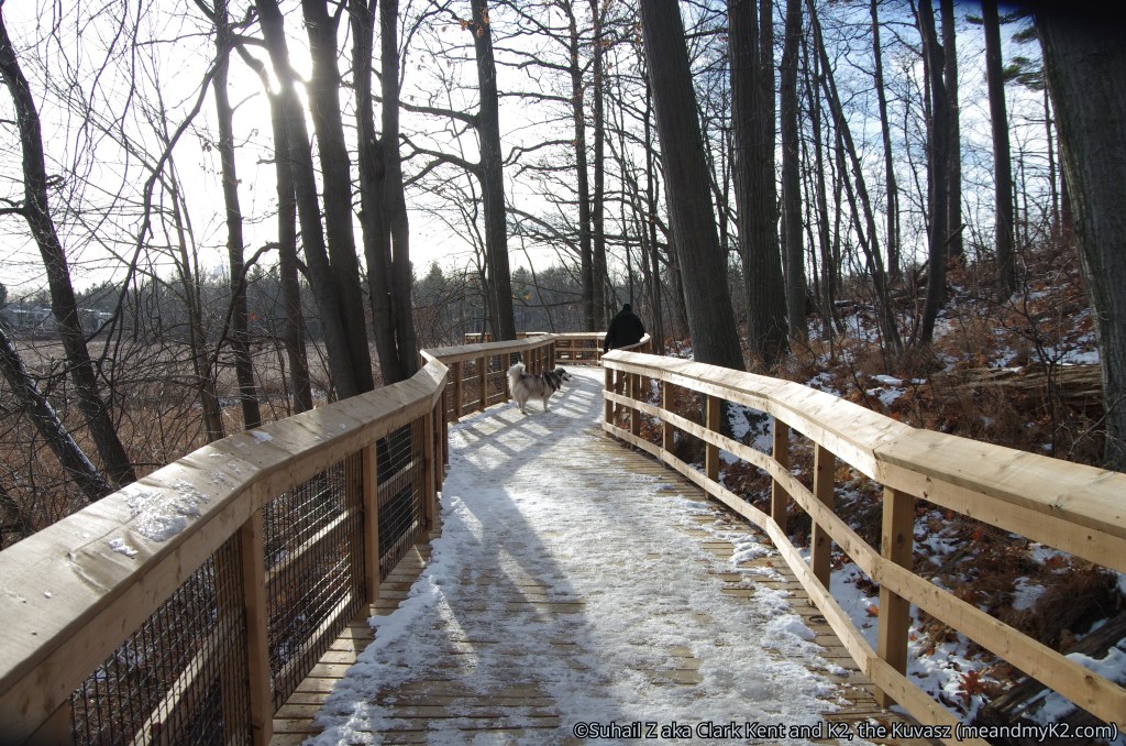 Here are two shots of my hiking with K2 on the boardwalks of Rattray Marsh in 2016: