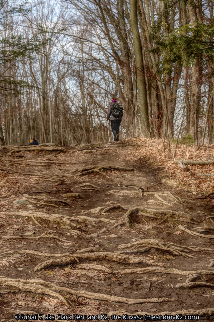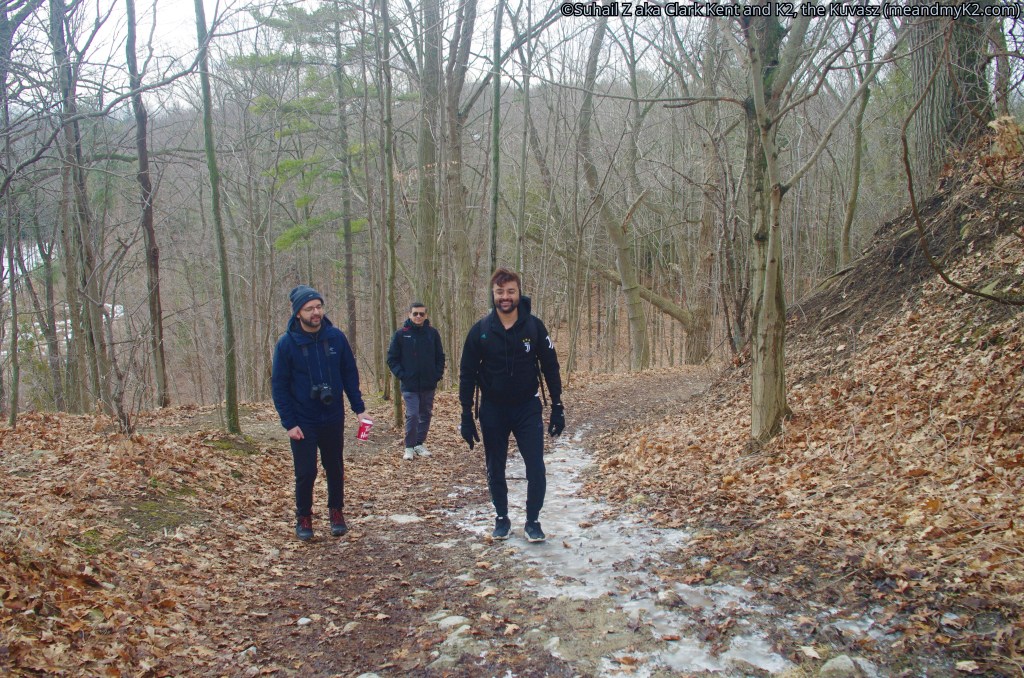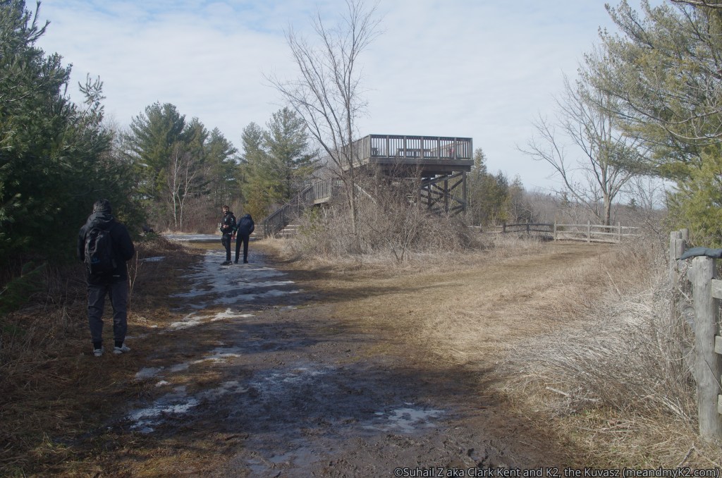We were hiking in post-ice melt muck on the trails. Our shoes were all covered in mud. Still, we were enjoying the hike in sunny 7 C temperatures on February 19, 2023.