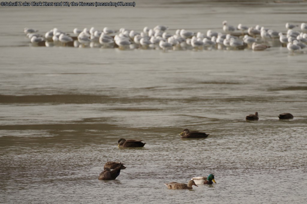 Mallards and black ducks in the freezing waters and gulls resting on ice bars in the far background.