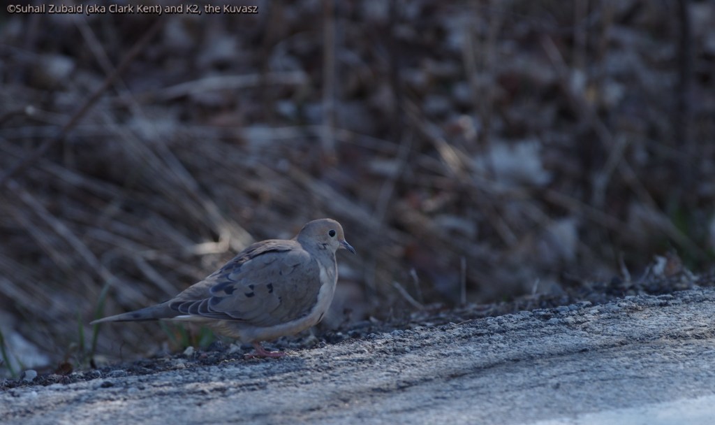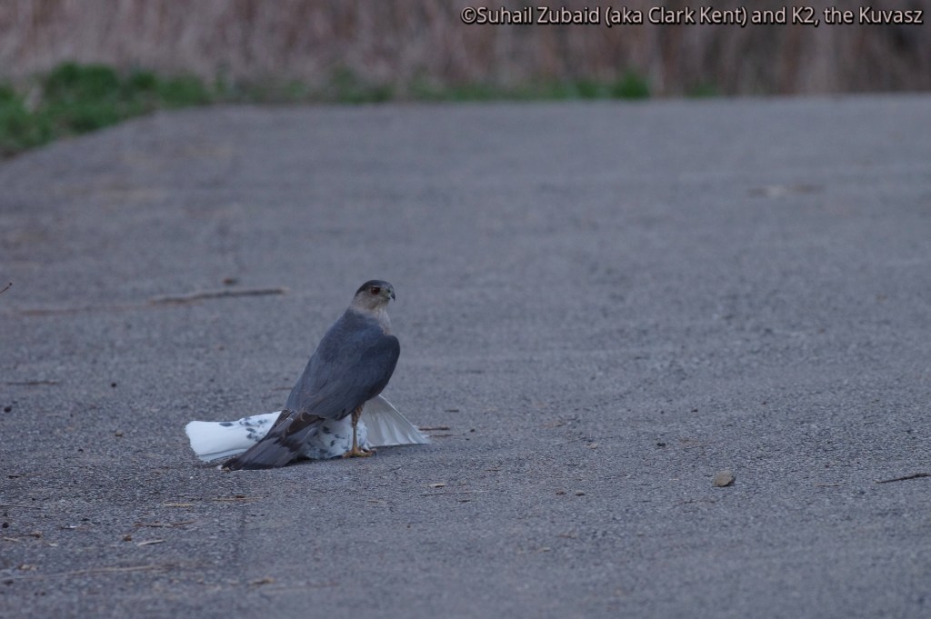 K2, our Hungarian Kuvasz, and I had almost completed our hike of observing and photographing urban wildlife. We stopped in awe as we saw a hawk sitting on a kill smack in the middle of the trail. Feathers of the unfortunate prey were scattered all over the grass and bush evidencing a desperate struggle for life. We did not want to disturb the raptor. In an attempt to give it a little space, we started retreating on the trail. With substantial distance between it and us, K2 and I waited for what seemed like ages. Finally, the raptor flew into the forest with the prey in its talons. I identified it as a Cooper’s Hawk with a feral pigeon kill.