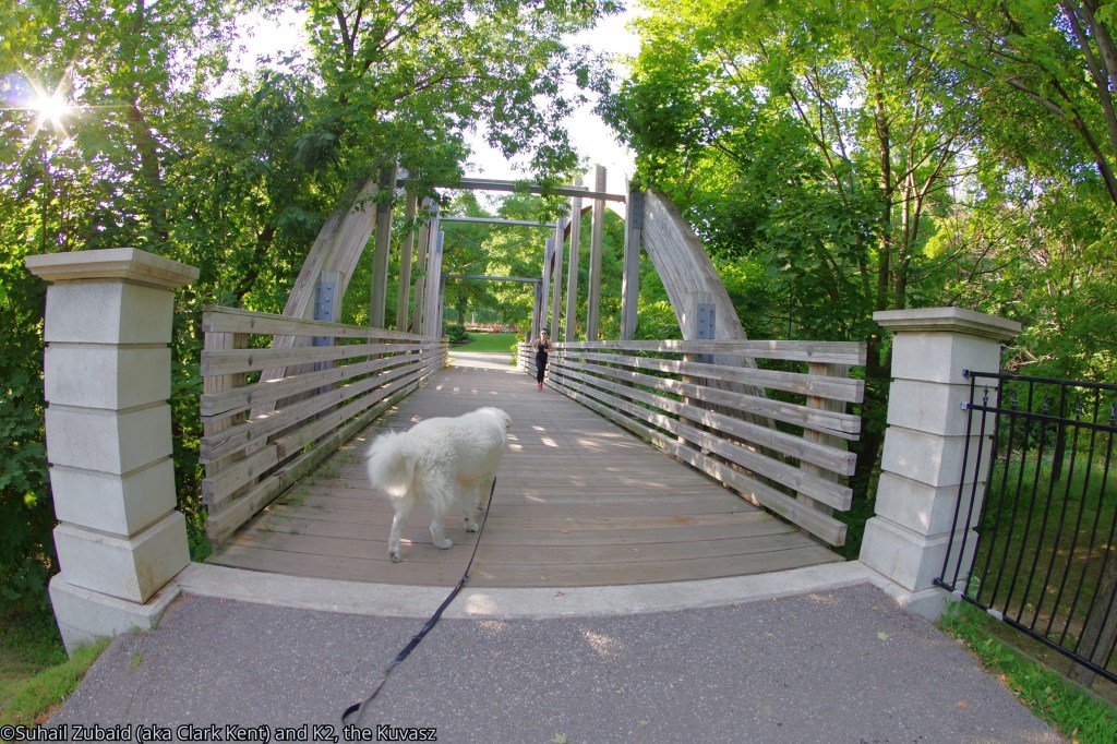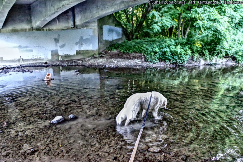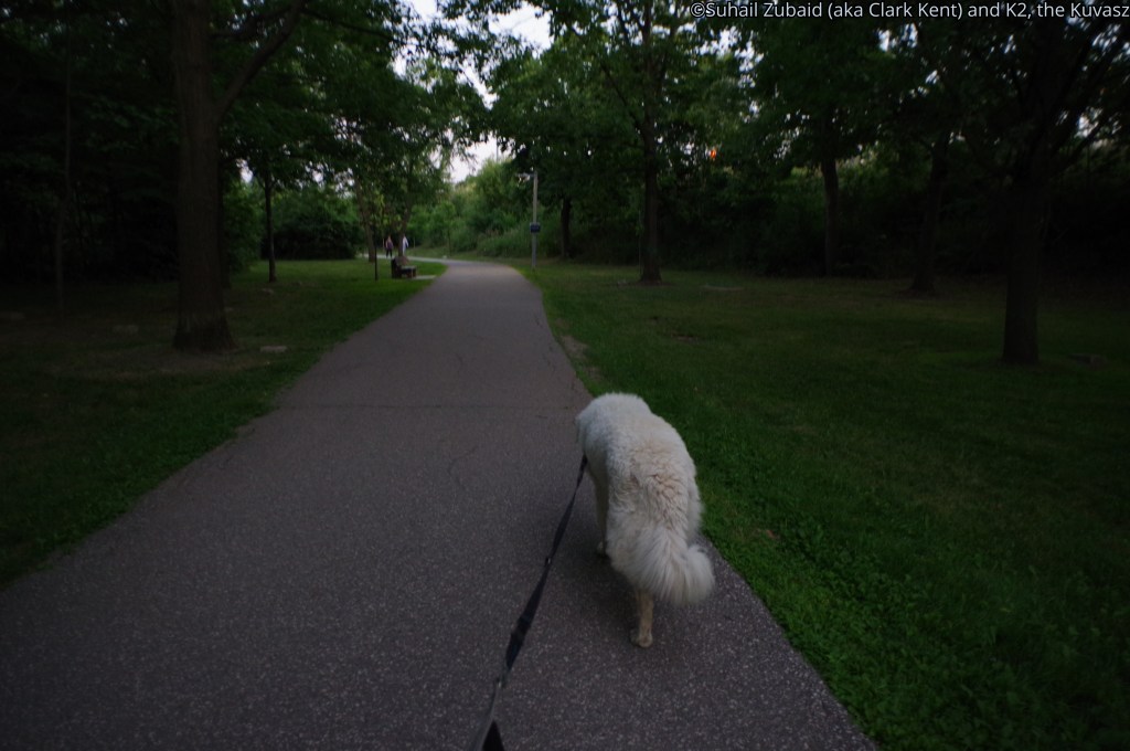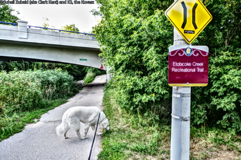 K2, our Hungarian Kuvasz (read here about this breed), and I were hiking on a lonely Etobicoke Creek Trail that meandered through the city of Brampton along the Etobicoke Creek. Since it passed through the busy sections of the city at a lower elevation, we were spared of the traffic and hustle and bustle of the city. It seemed that we were hiking through a sparsely populated mini-wilderness.