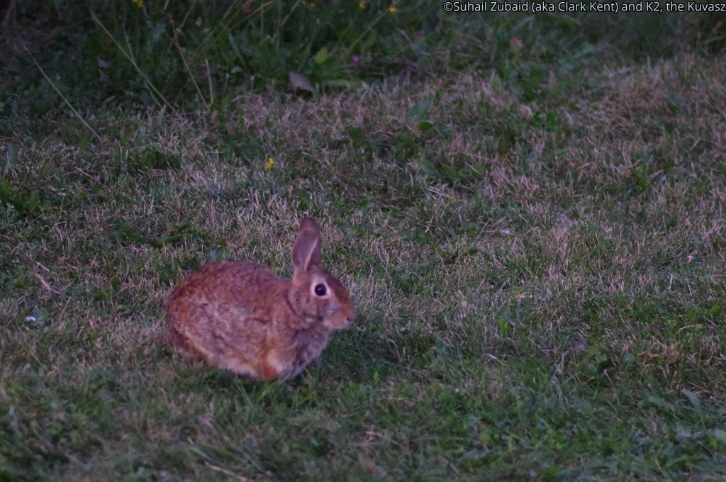 The following two shots of a mallard duck and eastern cottontail rabbit were taken at about 7:30 pm in a bushy area.