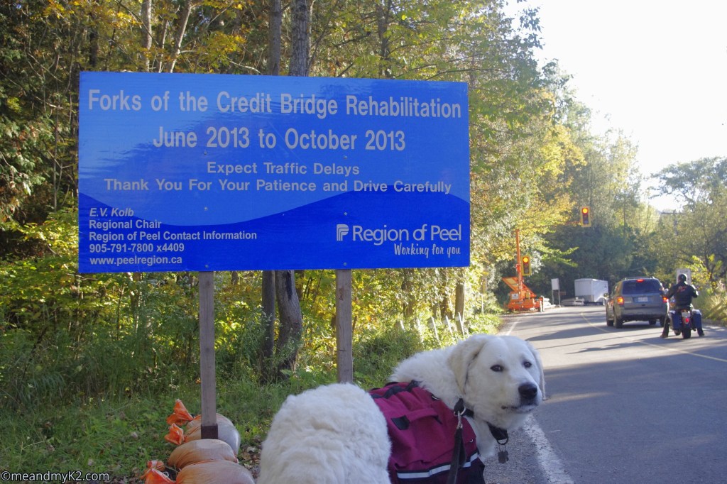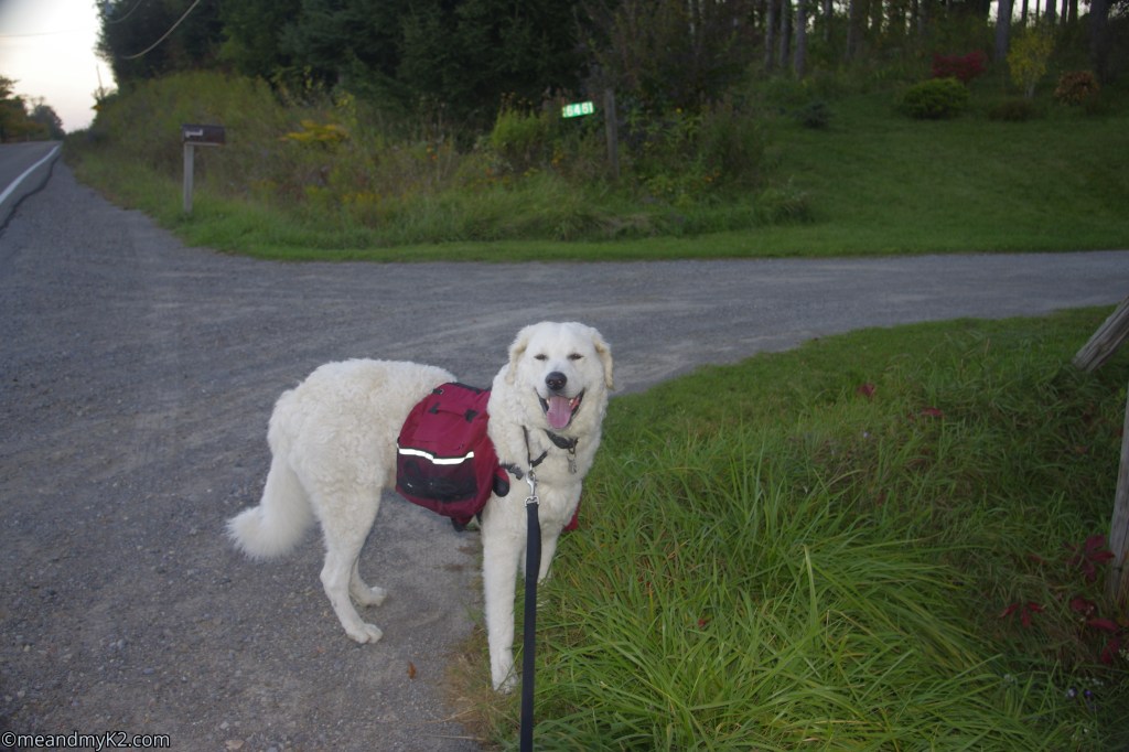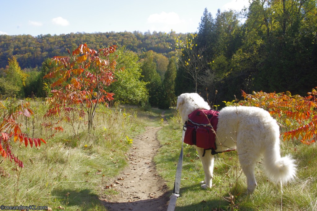 K2, our Hungarian Kuvasz, and I were hiking on Forks of the Credit Road that led us to the top of the Caledon Hills. We were enjoying our slow progress while the passing by cars stopped and offered us water and snacks. K2 was enjoying every bit of public attention.