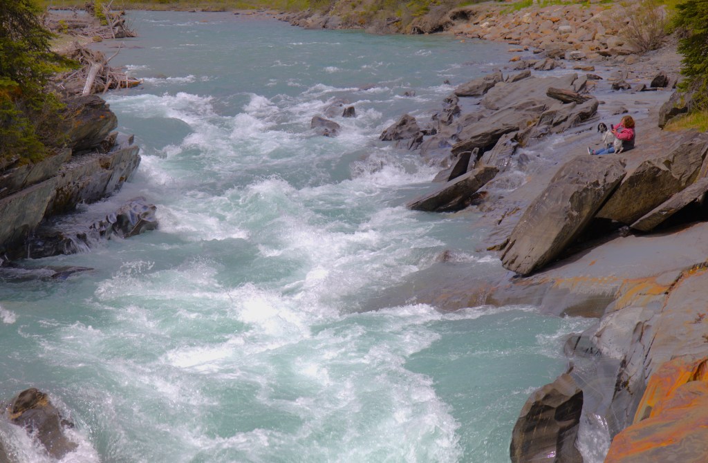 A lady and her dog were sitting on a rock by the side of the creek. While the lady, oblivious of our presence, was taking in the scenery, her dog noticed us and kept looking at us.